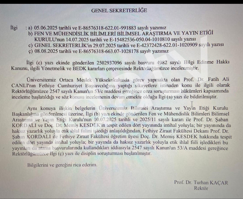 “Belgelerin Üniversitemiz Bilimsel Araştırma Yayın Etiği Kurulu Başkanlığına gönderilmesi üzerine, Fen ve Mühendislik Bilimleri Bilimsel Araştırma ve Yayın Etiği Kurulu’nun 10.07.2025 Tarihli ve 2025 / 11 Sayılı kararı ile Prof. Dr. Şaban Kordalı ve Doç Dr. Memiş Kesdek’in tespit edilen dört yayınında intihal yoluyla, bir yayınında da haksız yazarlık yoluyla etik ihlal fiilini işlediği anlaşıldığından, Fethiye Ziraat Fakültesi Dekanı Prof. Dr. Şaban Kordalı ile Fethiye Ziraat Fakültesi Öğretim Üyesi Doç Dr. Memiş Kesdek hakkında tespit edilen dört yayında intihal yoluyla, bir yayında da haksız yazarlık yoluyla etik ihlal fiili işledikleri bu yayınları da atama başvurularında kullandıkları iddiasıyla 2547 sayılı Kanun’un 53 / A maddesi gereğince Rektörlüğümüzce disiplin soruşturması başlatılmıştır.”