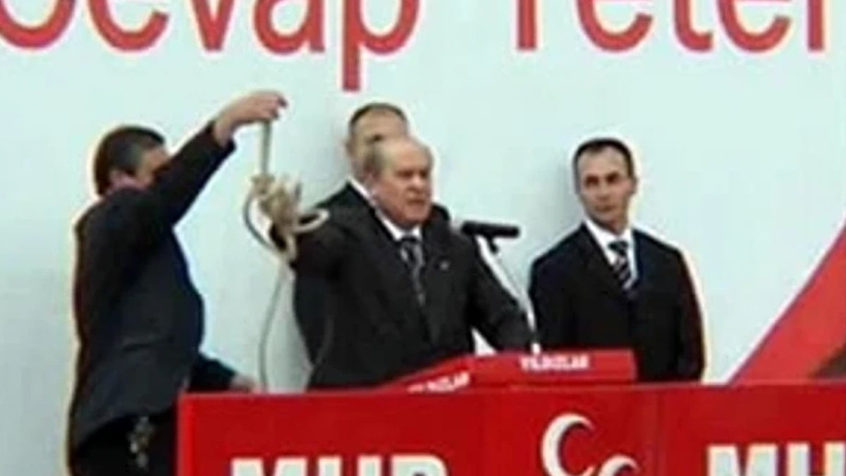 Bahçeli, “Meydanlarda bizim için ‘terörist başını asamadılar’ diyorlar. 129 milletvekilimiz vardı, sizin kadar olsaydı asılıp asılmadığını görürdünüz. Sen neden asmadın? Oğluna gemi alacak para buluyorsun, asacak ip mi bulamıyorsun? Alın o zaman şu ipi de asın!” diyerek kalabalığa ip fırlatmıştı.